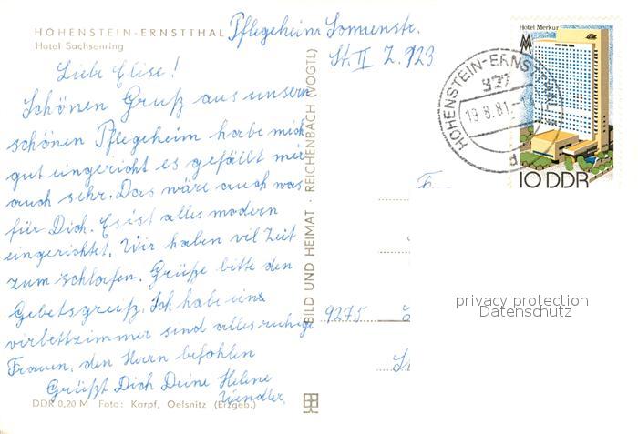 73549860 alte Postkarte Hohenstein-Ernstthal Hotel Sachsenring postalisch gelaufen Erhaltung siehe scans [WerneD78] KatCode: 11110014173100