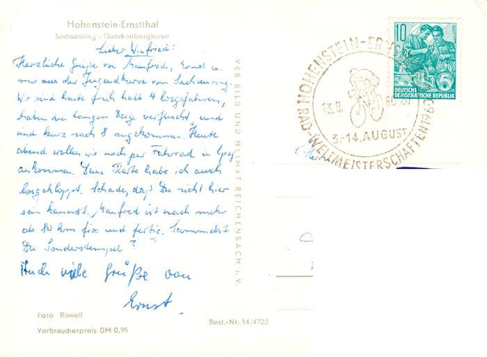 73873186 alte Postkarte Hohenstein-Ernstthal Rad-Weltmeisterschaften 1960 Erinnerungskarte postalisch gelaufen Erhaltung siehe scans [FriedD77] KatCode: 11110014173100