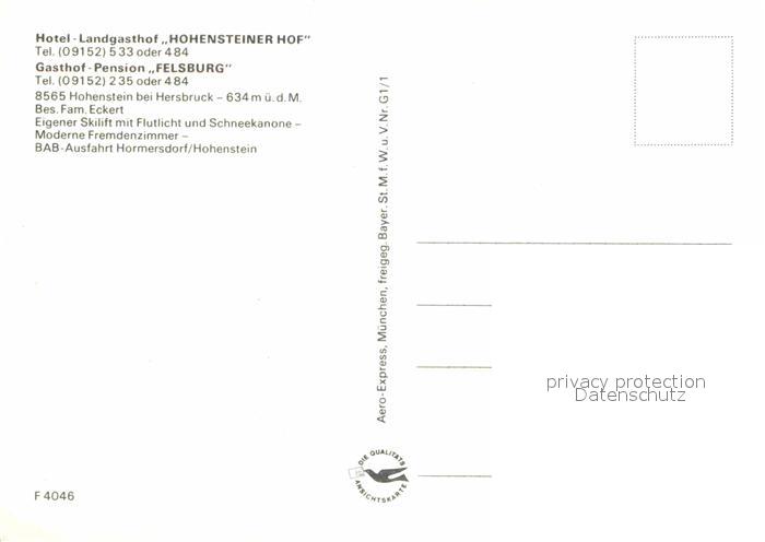 72760307 Hohenstein Kirchensittenbach Hotel Landgasthof Hohensteiner Hof Gasthof Pension Felsburg postalisch nicht gelaufen Erhaltung siehe scans [FriedD77] KatCode: 11110009574135