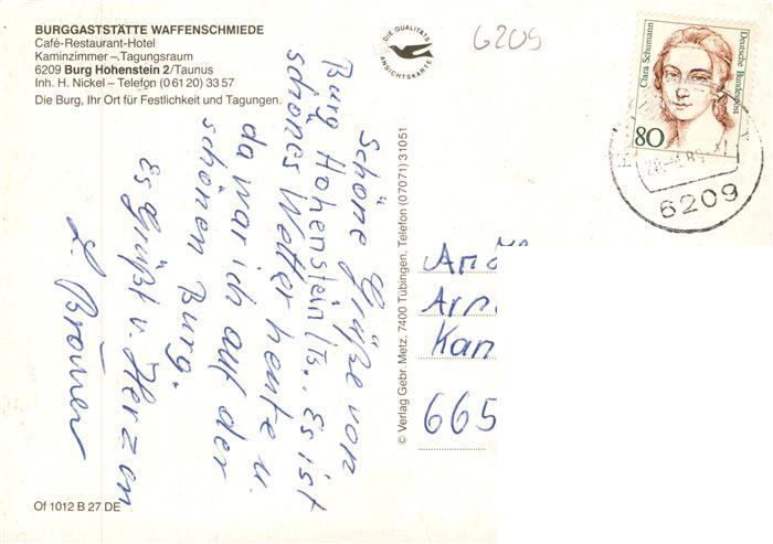 73936554 alte Postkarte Hohenstein Untertaunus Burggaststaette Waffenschmiede Gastraeume Burg postalisch gelaufen Erhaltung siehe scans [FriedD77] KatCode: 11110006439006