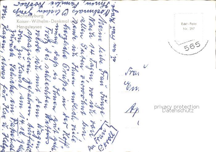 72038848 alte Postkarte Hohensyburg Kaiser Wilhelm Denkmal und Hengsteysee postalisch gelaufen Erhaltung siehe scans KatCode: 11110005913000