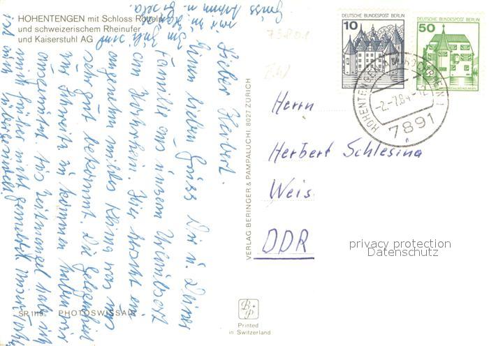 73643738 alte Postkarte Hohentengen Hochrhein mit Schloss Roetteln schweizerisches Rheinufer Kaiserstuhl AG postalisch gelaufen Erhaltung siehe scans [WerneD78] KatCode: 11110008337053