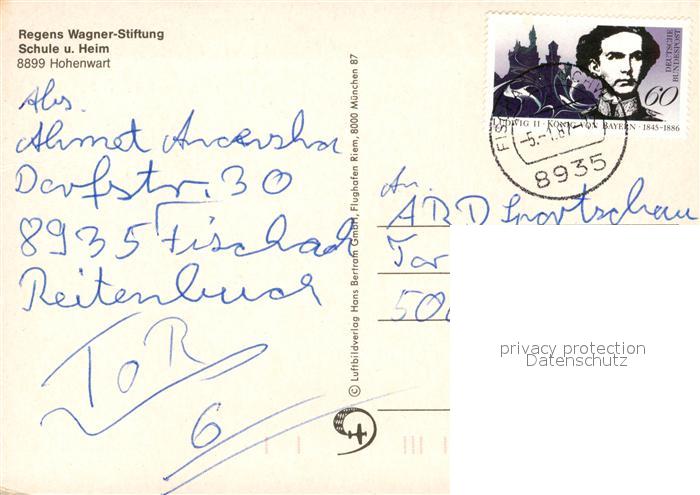 73321935 alte Postkarte Hohenwart Paar Fliegeraufnahme Rgens Wagner Stiftung postalisch gelaufen Erhaltung siehe scans [KathaD81] KatCode: 11110009186128