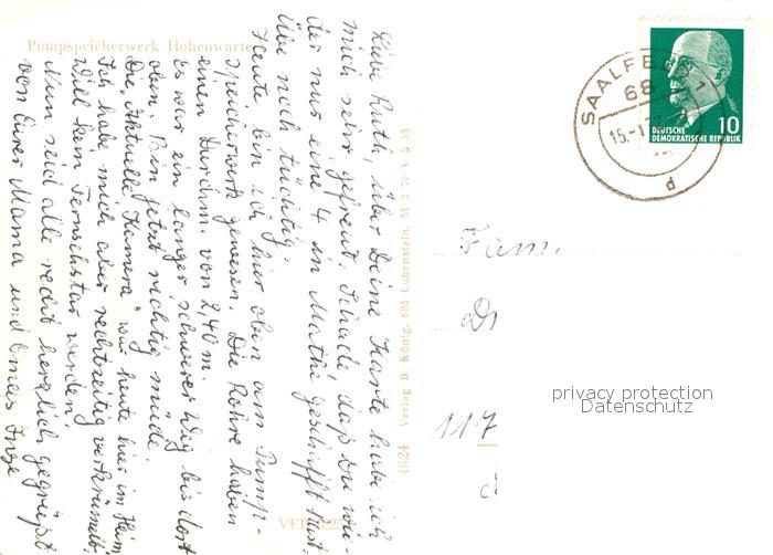 72941199 alte Postkarte Hohenwarte Pumpspeicherwerk postalisch gelaufen Erhaltung siehe scans [NatalD47] KatCode: 11110016073035