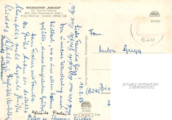 73650503 alte Postkarte Hohenwarth Koetzting Waldgasthof Hudlach postalisch gelaufen Erhaltung siehe scans [WerneD78] KatCode: 11110009372135