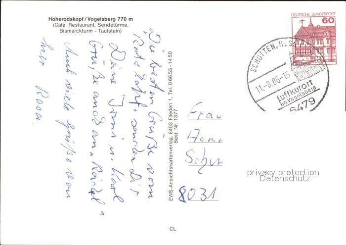 72465651 alte Postkarte Hoherodskopf Cafe Restaurant Sendetuerme Bismarckturm Taufstein postalisch gelaufen Erhaltung siehe scans KatCode: 11110006535016