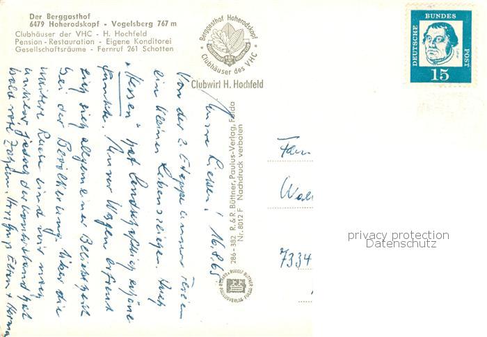 73829831 alte Postkarte Hoherodskopf Schotten Panorama Berggasthof Taufstein VHC Clubhaeuser Jugendherberge Forellenteich postalisch gelaufen Erhaltung siehe scans [WerneD78] KatCode: 11110006535016