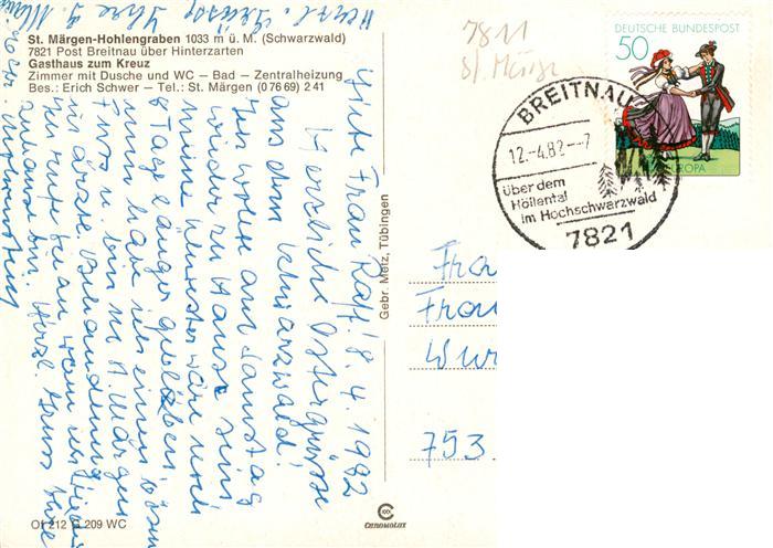 73929348 alte Postkarte Hohlengraben Breitnau Gasthaus zum Kreuz postalisch gelaufen Erhaltung siehe scans [FriedD77] KatCode: 11110008315016