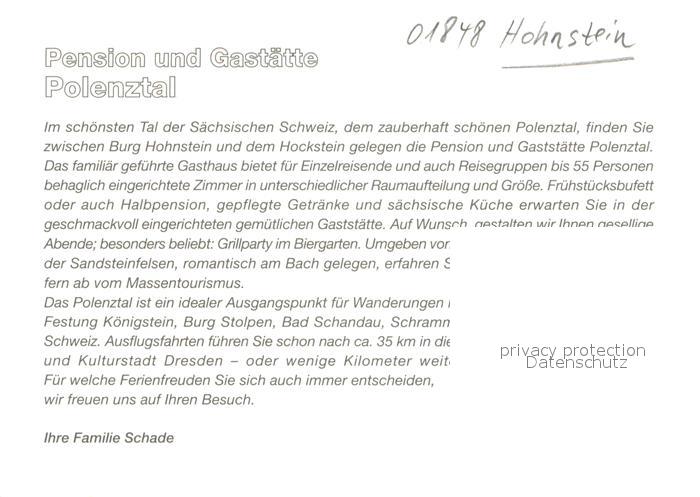 73651446 Hohnstein Saechsische Schweiz Gaststaette Polenztal Bar Gaststube Panorama postalisch nicht gelaufen Werbekarte (keine Postkarte) Erhaltung siehe scans [WerneD78] KatCode: 11110014287160
