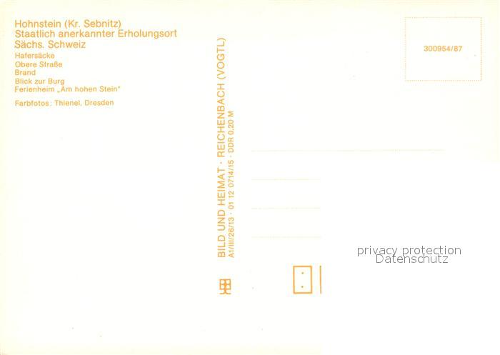 73041000 alte Postkarte Hohnstein Saechsische Schweiz Hafersaecke Obere Strasse Brand Burgblick Ferienheim Am hohen Stein postalisch gelaufen Erhaltung siehe scans [WerneD78] KatCode: 11110014287160
