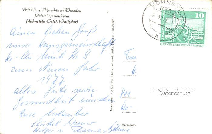 72427725 alte Postkarte Hohnstein Saechsische Schweiz VEB Verp. Maschinen Dresden Betriebsferienheim postalisch gelaufen Erhaltung siehe scans KatCode: 11110014287160