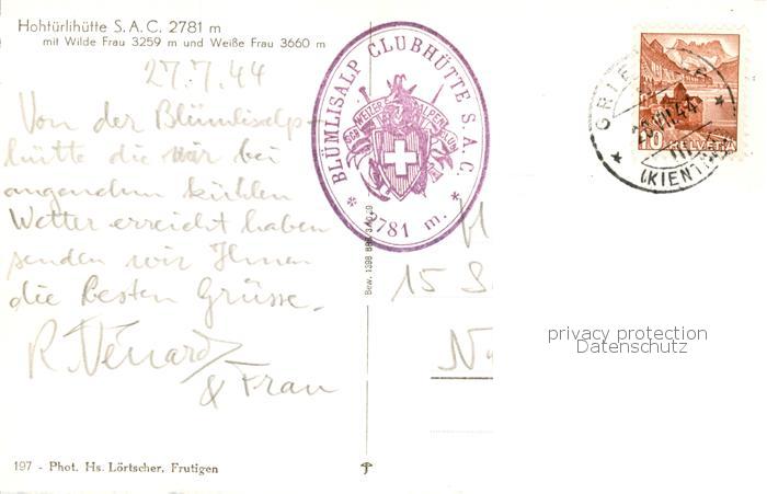13795067 alte Postkarte Hohthuerlihuette 2778m Hohtuerlihuette BE Aussenansicht u. Wilde-Frau u. Weisse-Frau postalisch gelaufen Erhaltung siehe scans [LiesaD40] KatCode: 11470410195502