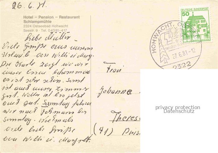 74084482 alte Postkarte Hohwacht Ostseebad Schleswig-Holstein Hotel Schlampmuehle postalisch gelaufen Erhaltung siehe scans [WerneD78] KatCode: 11110001057030
