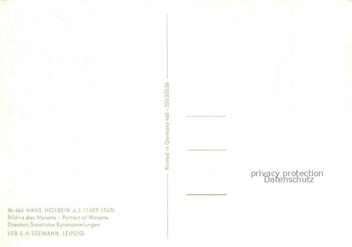 74154319 Holbein Hans D. J. the Younger (1497-1543) Kuenstlerkarte Bildnis des Morette Leipzig Dresden postalisch nicht gelaufen Erhaltung siehe scans [SanaeD93] KatCode: 22240000003200
