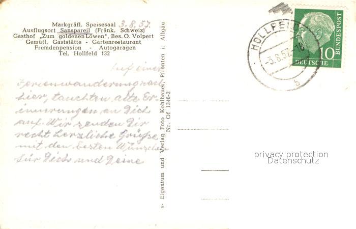 72956827 alte Postkarte Hollfeld Ausflugsort Sanspareil Gasthof Zum goldenen Loewen Markgraeflicher Speisesaal postalisch gelaufen Erhaltung siehe scans [FriedD77] KatCode: 11110009472154