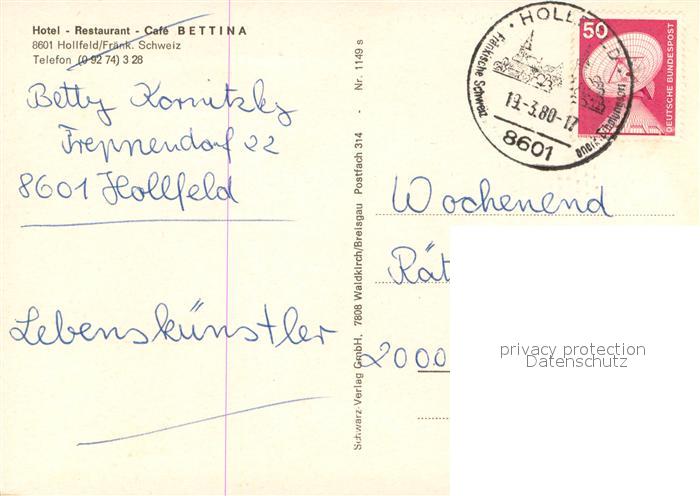 73724654 alte Postkarte Hollfeld Hotel Restaurant Cafe Bettina Gastraum postalisch gelaufen Erhaltung siehe scans [FriedD77] KatCode: 11110009472154