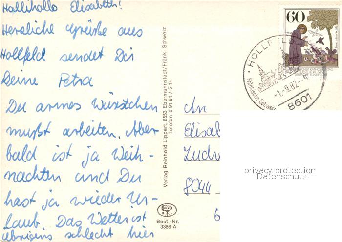 73780323 alte Postkarte Hollfeld Kirche Hallenbad Schule Parkanlagen Denkmal Statue postalisch gelaufen Erhaltung siehe scans [FriedD77] KatCode: 11110009472154