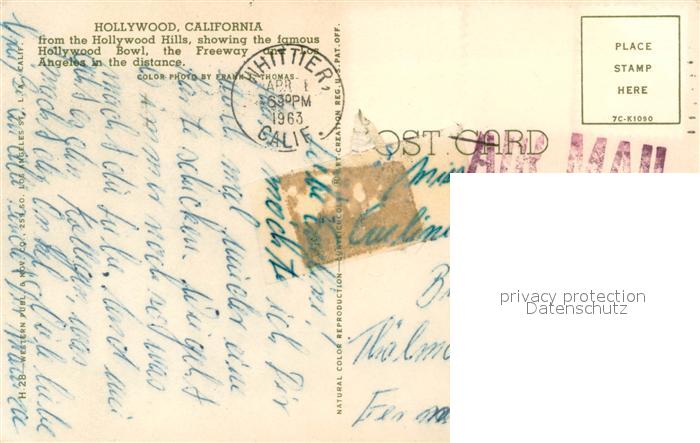 73667353 old postcard Hollywood California from the Hollywood Hills Hollywood Bowl Freeway and Los Angeles postalisch gelaufen Erhaltung siehe scans [WerneD78] KatCode: 14140