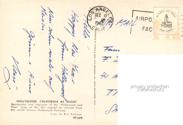 73302472 old postcard Hollywood California Glamour City Hollywood and Vine area at night postalisch gelaufen Erhaltung siehe scans [FriedD77] KatCode: 14140