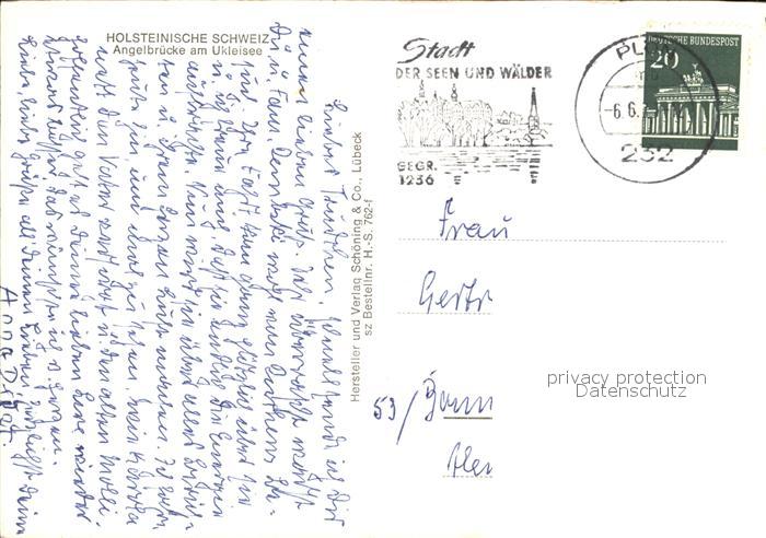 72413069 alte Postkarte Holsteinische Schweiz Angelbruecke am Ukleisee postalisch gelaufen Erhaltung siehe scans KatCode: 11110