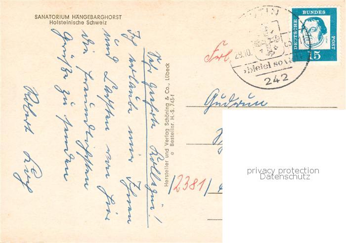 73860024 Holsteinische Schweiz Sanatorium Haengebarghorst postalisch gelaufen Erhaltung siehe scans [WerneD78] alte Postkarte Wern Katcode 11110