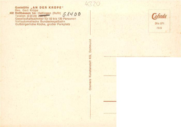 73894072 Holthausen Muelheim Ruhr Gaststaette An der Kruepe Gastraeume Kegelbahn postalisch nicht gelaufen Erhaltung siehe scans [WerneD78] KatCode: 11110005117000