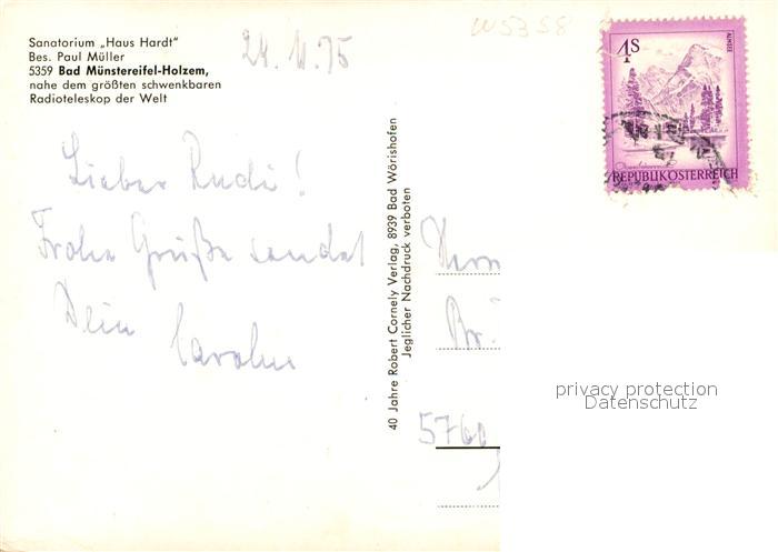 73164403 alte Postkarte Holzem Eifel Sanatorium Haus Hardt Radioteleskop Park postalisch gelaufen Erhaltung siehe scans [WerneD78] KatCode: 11110005366004