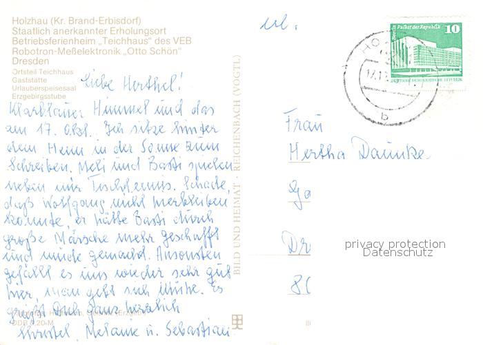 73155376 alte Postkarte Holzhau Brand-Erbisdorf Betriebsferienheim Teichhaus Gaststaette Urlauberspeisesaal Erzgebirgsstube postalisch gelaufen Erhaltung siehe scans [WerneD78] KatCode: 11110014177030
