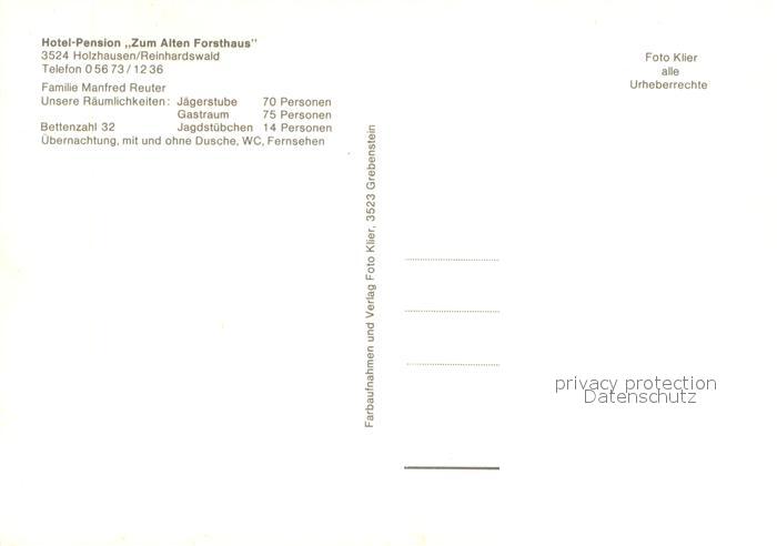 73652871 Holzhausen Reinhardswald Hotel Pension Zum alten Forsthaus Restaurant Kamin Fremdenzimmer postalisch nicht gelaufen Erhaltung siehe scans [FriedD77] KatCode: 11110006633014