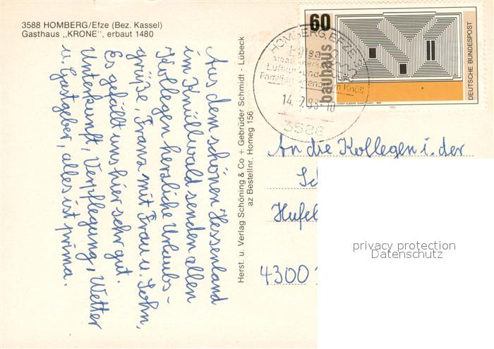 73646023 alte Postkarte Homberg Efze Gasthaus Krone Fachwerkhaus 15. Jhdt. Historisches Gebaeude postalisch gelaufen Erhaltung siehe scans [FriedD77] KatCode: 11110006634009