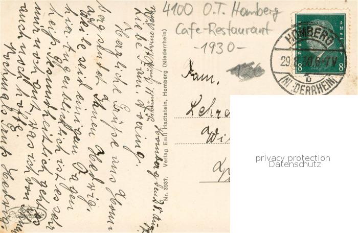 73702296 alte Postkarte Homberg Niederrhein Cafe-Restaurant Rheingarten-Terrasse postalisch gelaufen Erhaltung siehe scans [LiesaD40] KatCode: 11110005112000