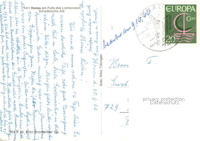 72948123 alte Postkarte Honau Lichtenstein Panorama Blick ins Tal Kirche Traifelbergfelsen Eichazquelle Schwaebische Alb Ritter Bromsilber postalisch gelaufen Erhaltung siehe scans [FriedD77] KatCode: 11110008415092