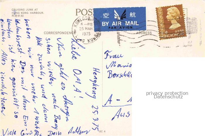 HONGKONG Hong-Kong HK Cruising Junk AT postalisch gelaufen Erhaltung siehe scans [WerneD78] alte Postkarte Wern Katcode 12030900900