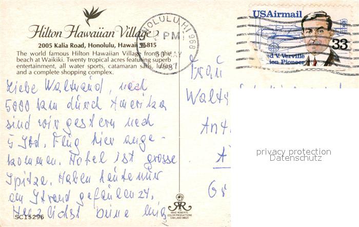 73581860 old postcard Honolulu Hilton Hawaiian Village postalisch gelaufen Erhaltung siehe scans [LiesaD40] KatCode: 14140130000000