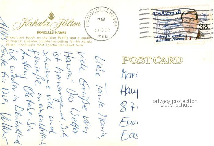 73661877 old postcard Honolulu Hotel Kahala Hilton Beach postalisch gelaufen Erhaltung siehe scans [FriedD77] KatCode: 14140130000000