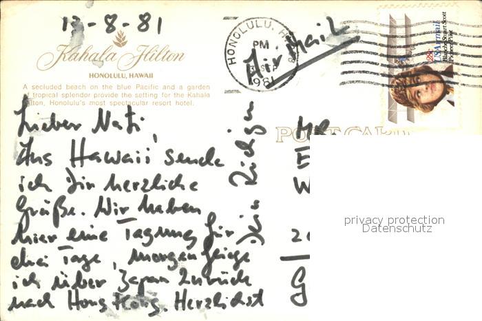72179132 old postcard Honolulu Kahala Hilton postalisch gelaufen Erhaltung siehe scans KatCode: 14140130000000