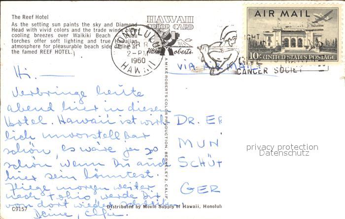 72430954 old postcard Honolulu Reef Hotel Waikiki Beach postalisch gelaufen Erhaltung siehe scans KatCode: 14140130000000