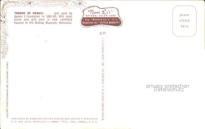 72482889 Honolulu Throne of Queen Liliuokatani Bishop Museum postalisch nicht gelaufen Erhaltung siehe scans KatCode: 14140130000000