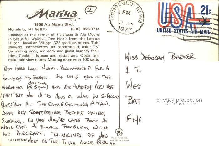 72397931 old postcard Honolulu Waikiki Marina Hotel postalisch gelaufen Erhaltung siehe scans KatCode: 14140130000000