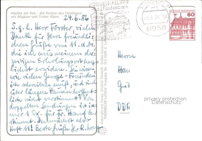 72573955 alte Postkarte Hopfen See Fliegeraufnahme mit Allgaeuer und Tiroler Alpen postalisch gelaufen Erhaltung siehe scans [LiesaD40] KatCode: 11110009777129
