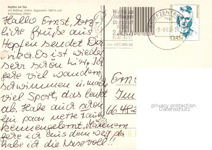 73168596 alte Postkarte Hopfen See Fliegeraufnahme mit Rossberg Aggenstein und Beatenberg postalisch gelaufen Erhaltung siehe scans [WerneD78] KatCode: 11110009777129
