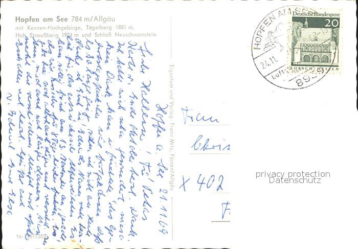 72455259 alte Postkarte Hopfen See Kenzen Hochgebirge Tegelberg Strausserg Schloss Neushwanstein postalisch gelaufen Erhaltung siehe scans KatCode: 11110009777129