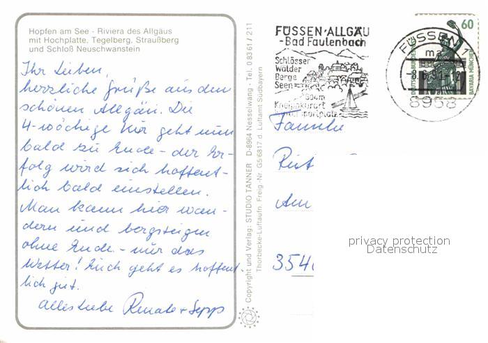 72872447 alte Postkarte Hopfen See mit Hochplatte Tegelberg Straussberg und Schloss Neuschwanstein Fliegeraufnahme postalisch gelaufen Erhaltung siehe scans [FriedD77] KatCode: 11110009777129