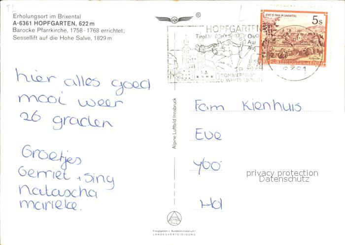12469701 alte Postkarte Hopfgarten Brixental Barocke Pfarrkirche Sessellift Hohe Salve Fliegeraufnahme postalisch gelaufen Erhaltung siehe scans KatCode: 11390335070406