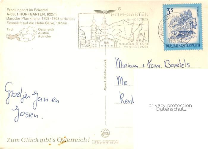 73219765 alte Postkarte Hopfgarten Brixental Barockkirche Hohe Salve Alpenpanorama Fliegeraufnahme postalisch gelaufen Erhaltung siehe scans [FriedD77] KatCode: 11390335070406