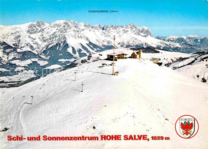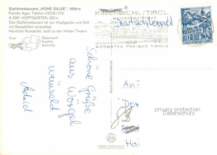 72619689 alte Postkarte Hopfgarten Brixental Skizentrum Gipfelrestaurant Hohe Salve Alpenpanorama Fernsicht postalisch gelaufen Erhaltung siehe scans [FriedD77] KatCode: 11390335070406