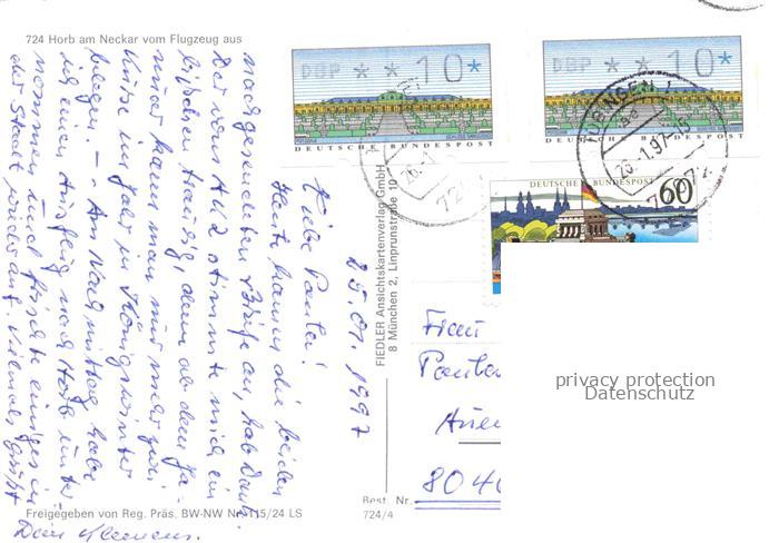 74157634 alte Postkarte Horb Neckar BW Neckar Bahnhof Altstadt Kirche Flussschleife Felder Wohngebiete Luftbild postalisch gelaufen Fliegeraufnahme Erhaltung siehe scans [Karloger] KatCode: 11110008237040