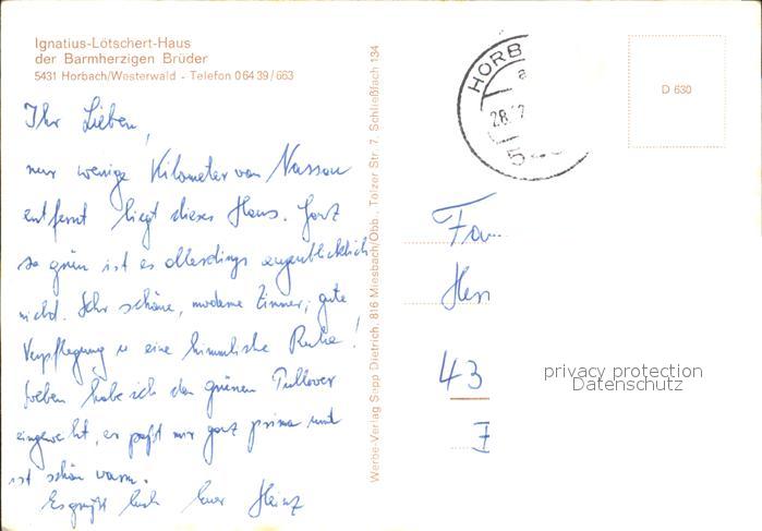 72109899 alte Postkarte Horbach Westerwald Ignatius Loetschert Haus der Barmh Brueder postalisch gelaufen Erhaltung siehe scans KatCode: 11110007143034