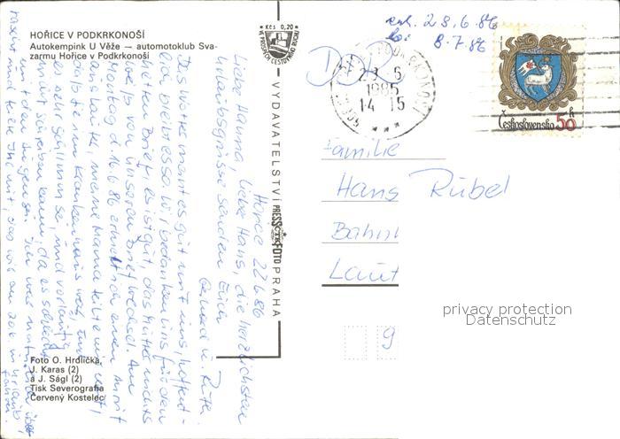 old postcard Horice v Podkrkonosi Autokempink U Veze automotoklub Svazarmu Holice v Podkrkonosi postalisch gelaufen Erhaltung siehe scans