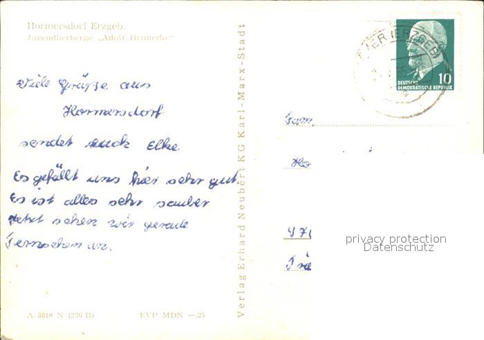 72473975 alte Postkarte Hormersdorf Erzgebirge Jugendherberge Adolf Hennecke postalisch gelaufen Erhaltung siehe scans KatCode: 11110014188110